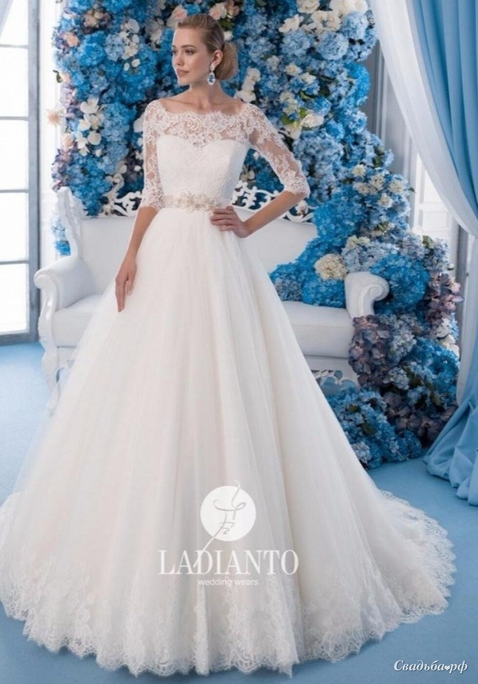 Классическое свадебное платье с пышной юбкой, отделанной по низу кружевами и кружевным лифом с рукавами 3/4.