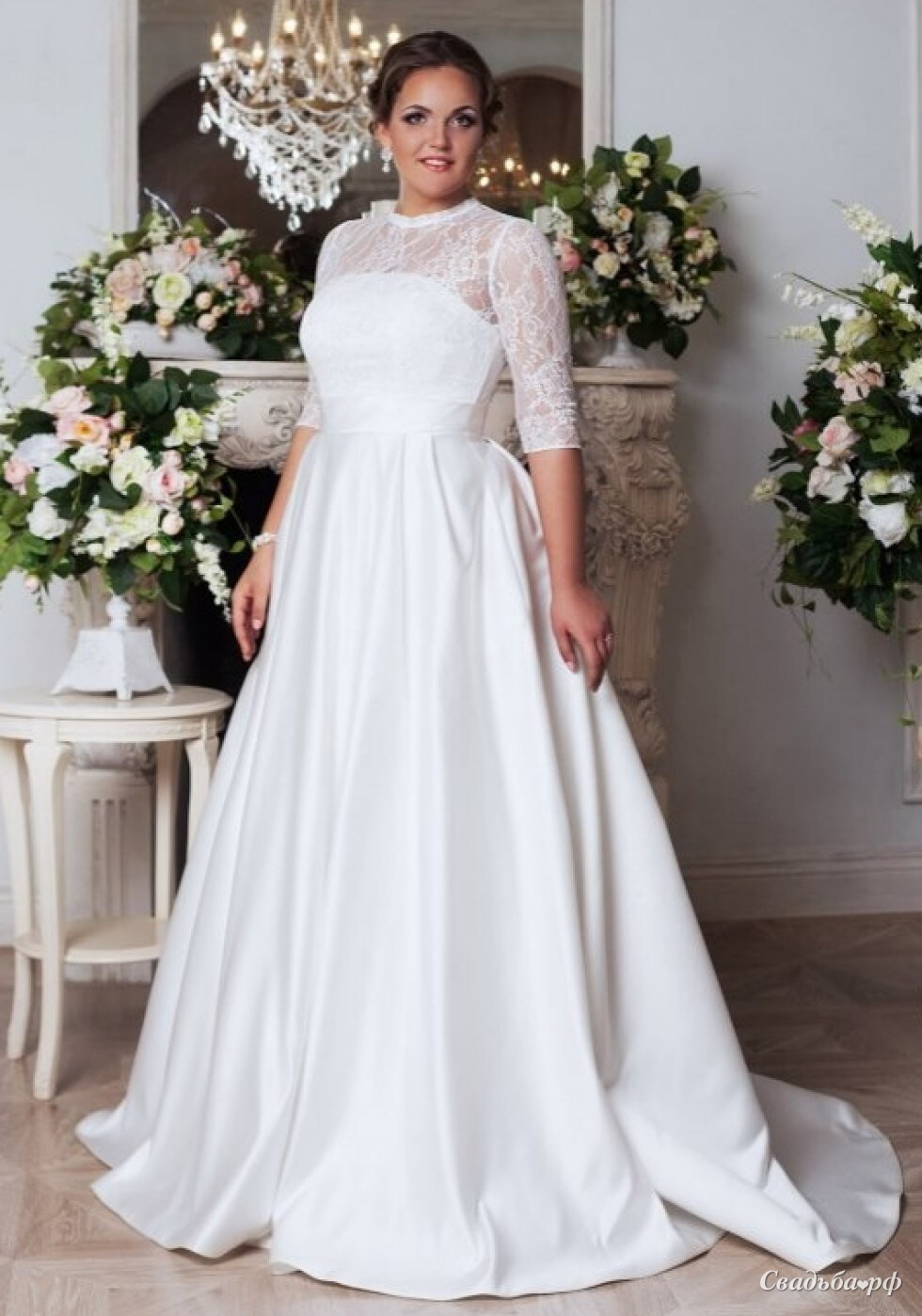 Классическое свадебное платье из атласа со шлейфом и кружевным лифом с рукавами. Для пышных красавиц.