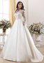 Классическое шикарное свадебное платье с атласной юбкой с небольшим шлейфом и кружевным лифом, а также длинными рукавами из кружева.