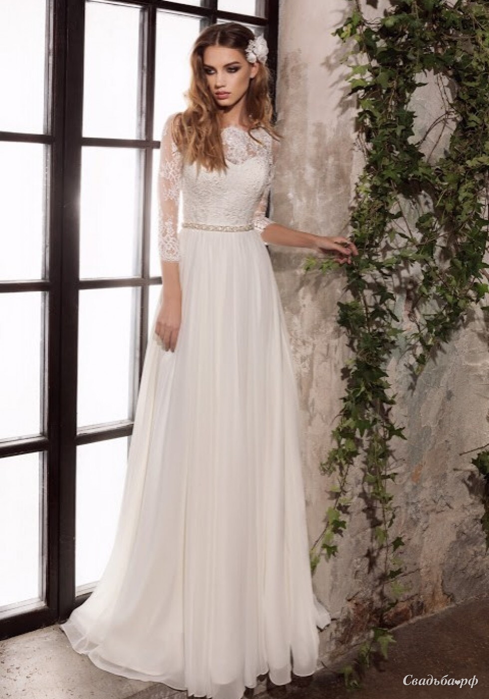 Романтичное легкое платье с кружевным лифом и длинными рукавами и юбкой из струящегося шифона.