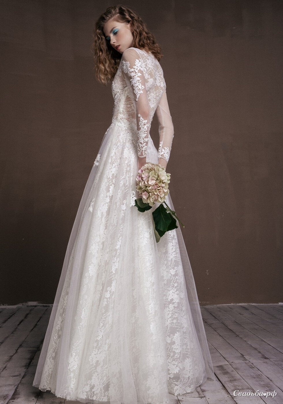 Нежное платье в стиле "Бохо" выполнено из кружева шантильи с прозрачным кружевным лифом и рукавами. Лиф отделан элементами кордового кружева и тонким вышитым пояском по талии. Платье легкое и утонченное.