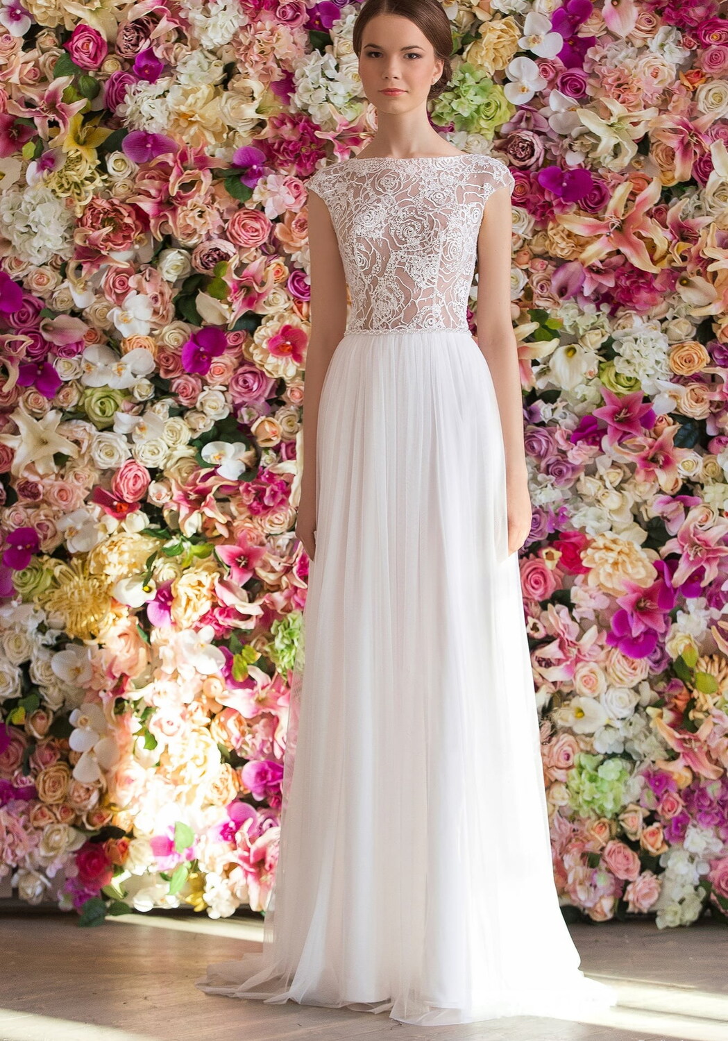 Легкое нежное платье с кружевным прозрачным лифом и юбкой из евросетки.
