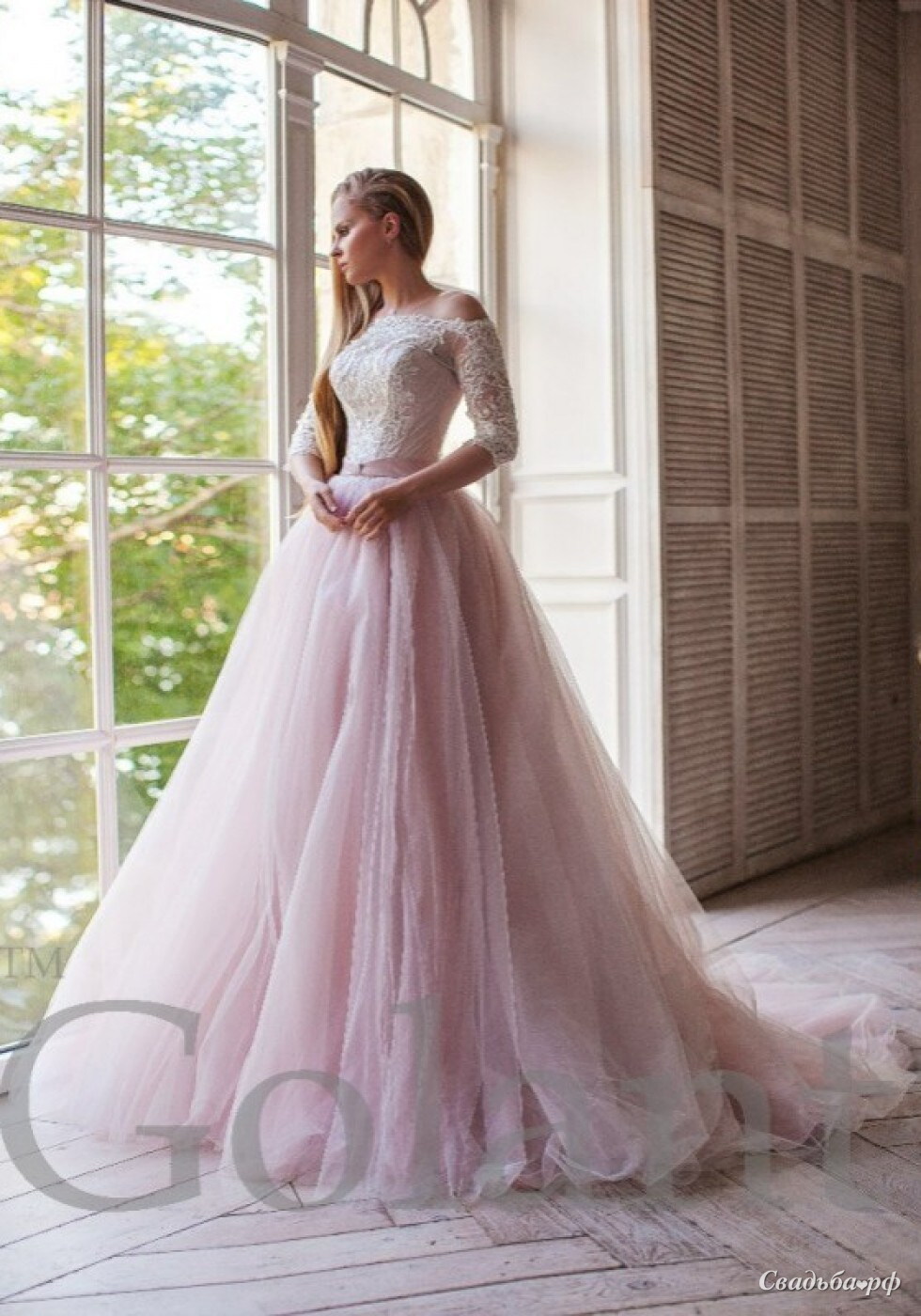 Роскошное пышное свадебное платье цвета "пудра" с кружевным лифом и рукавами из кружева.