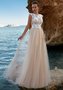 Нежное, воздушное свадебное платье стиля "бохо" с кружевным лифом и открытой спинкой, особенно эффектно смотрится в пудровом цвете.