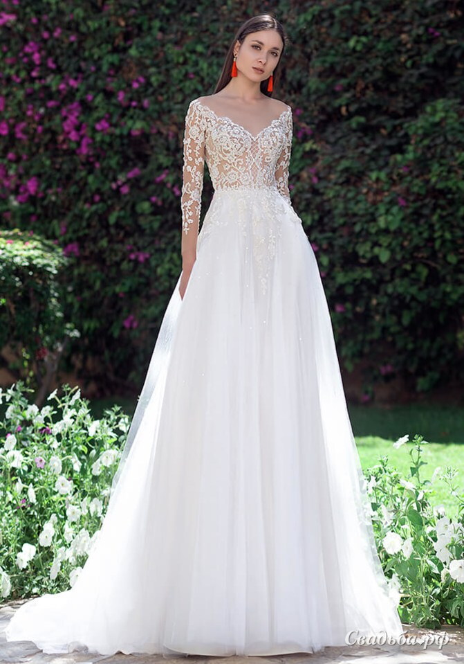 Свадебное платье с кружевным лифом и рукавами 3/4 и легкая воздушная юбка из евросетки.
