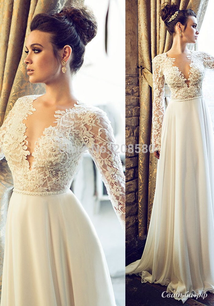Нежное шифоновое платье с кружевным лифом и длинными рукавами.