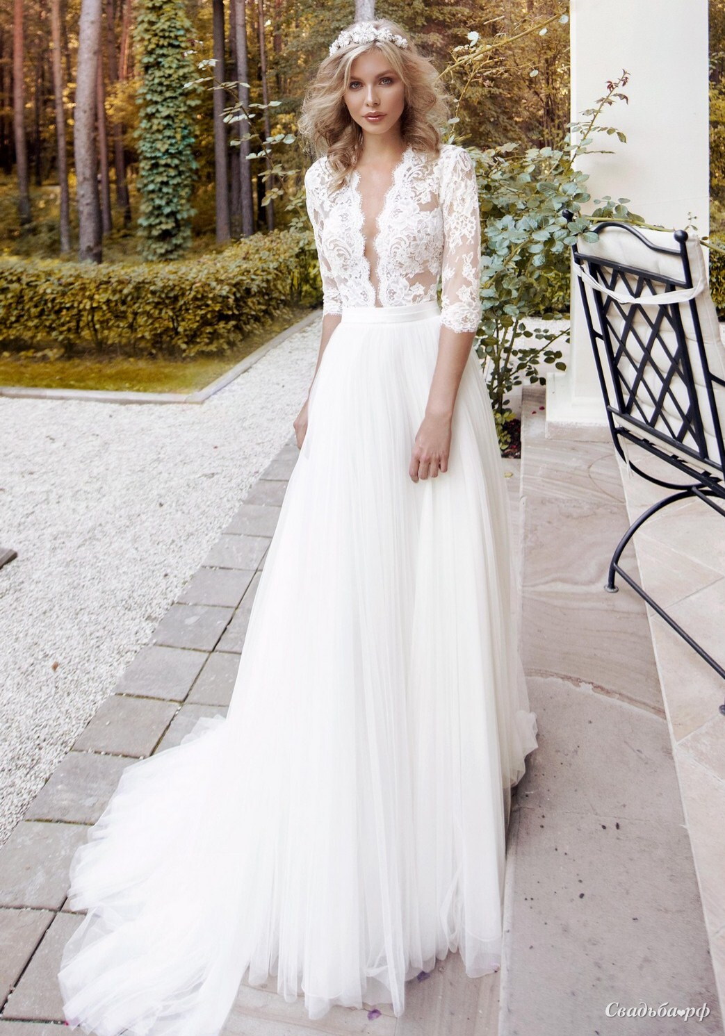 Легкое свадебное платье с кружевным лифом, рукавами 3/4 и летящей юбкой из евросетки с небольшим шлейфом.