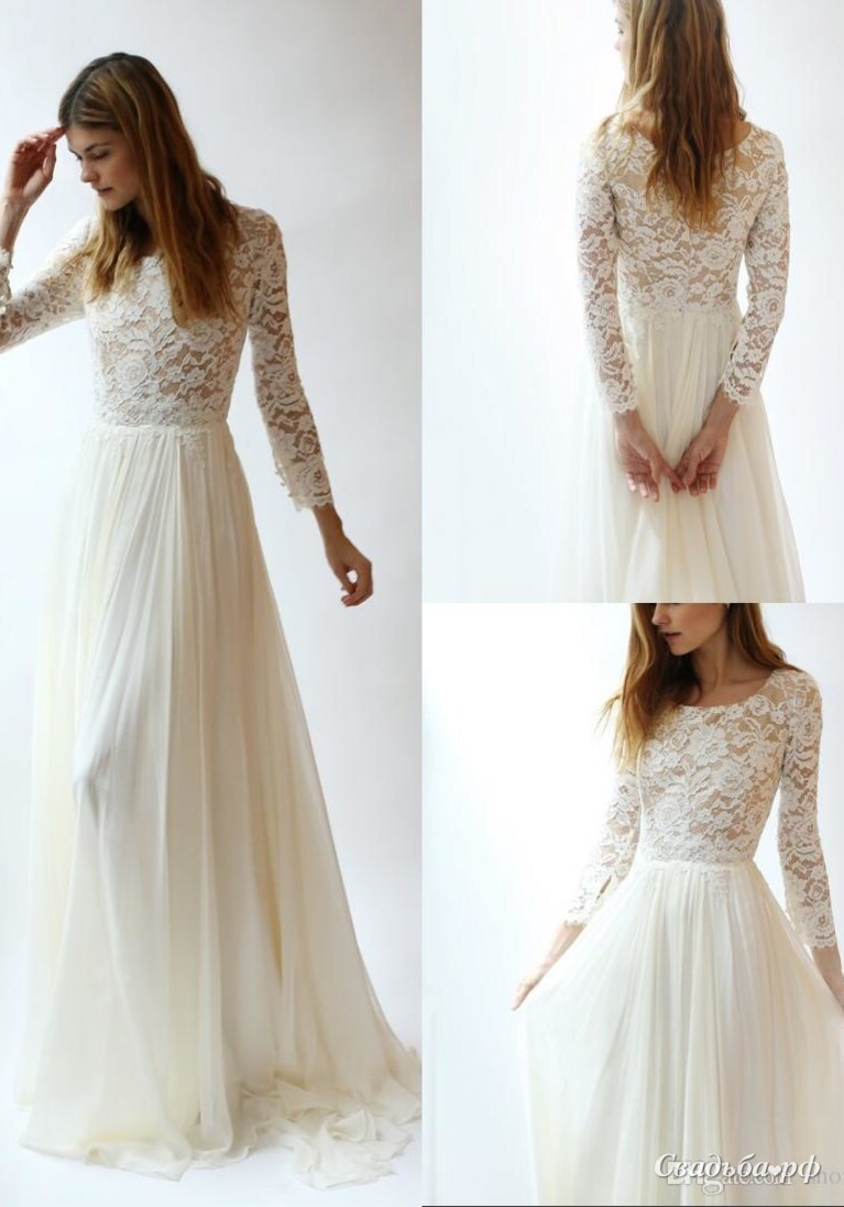 Нежное романтичное платье с шифоновой юбкой, сзади небольшой шлейф. С кружевным лифом и рукавами .