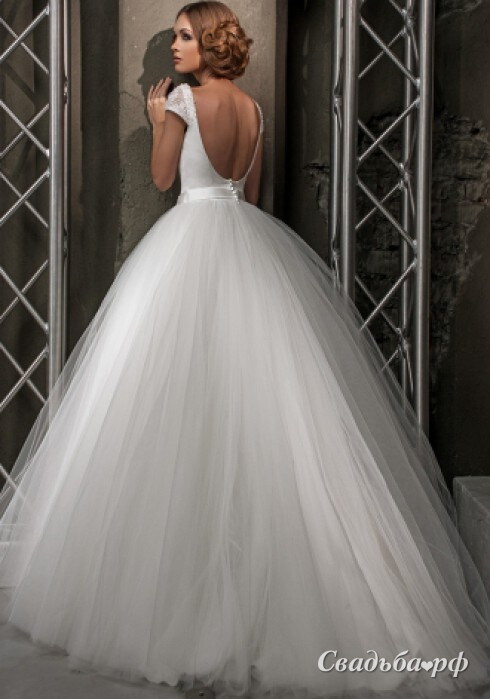 О роскошном свадебное платье А-силуэта каждая женщина мечтает с детства. Представленная модель от именитого бренда Love Bridal выгодно подчёркивает талию и привлекает внимание всех окружающих к соблазнительно открытой спинке. Небольшие рукавчики-крылышки придают модели трогательность. Пышная юбка со шлейфом удивляет своей лёгкостью.