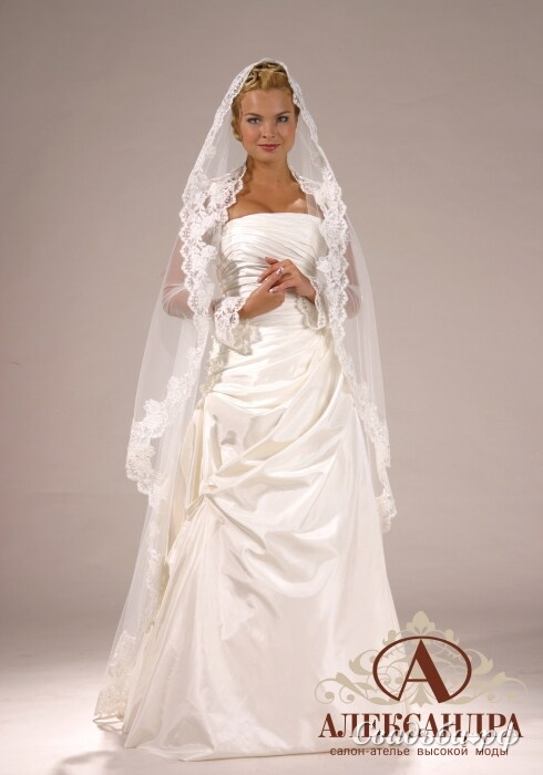 "Эвита" - очаровательная простота истинного благородства. Обратите внимание на искусную драпировку: роскошь наряда не выглядит вызывающей, но ее заметит тот, кто разбирается в стиле. Ажурное болеро и фата-палантин завершает образ изящной леди.