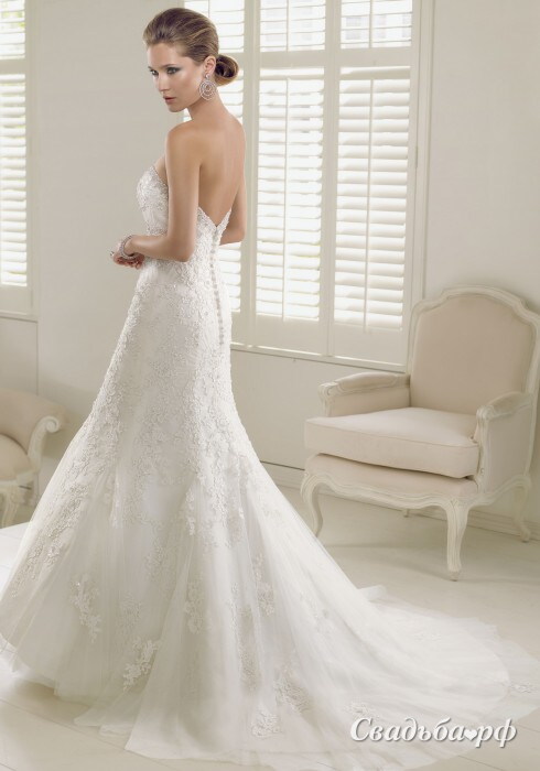 Невесомый наряд из лёгкого гипюра и вуали разработано лучшими отечественными дизайнерами. Представленная модель из новой коллекции 2014 года придётся по вкусу самым требовательным модницам. Облегающий наряд с соблазнительно оголённой зоной декольте и спинкой привлекает внимание. Длинная юбка постепенно расширяется к полу и переходит в шлейф.