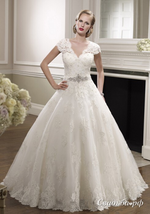 Изумительное свадебное платье со скромной зоной декольте и ажурными плечиками поможет создать целомудренный образ современной невесты. Модель драпирована гипюром и вуалью. Талия подчёркнута сверкающей вышивкой. Пышная юбочка дополнена шлейфом. В таком наряде из новой коллекции 2014 года Вы будете блистать и покорять с первого взгляда.
