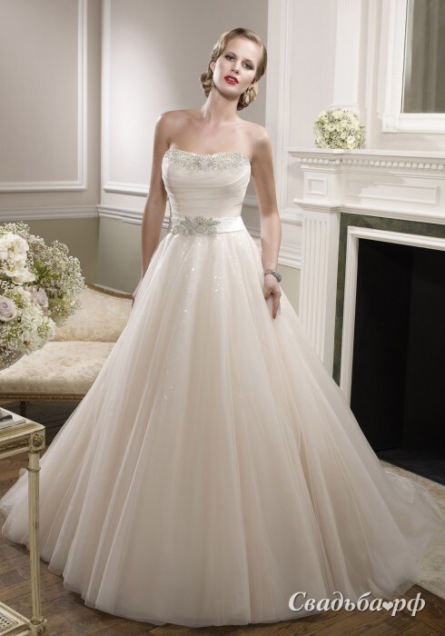 Декольтированное свадебное платье из свежей коллекции 2014 года подчеркнёт все прелести Вашей фигурки. Верх лёгкого корсета украшен сверкающей вставкой. Поясок также расшит вручную пайетками и бусинами. Пышная юбка переходит в роскошный шлейф. Эта стильная модель позволит создать неотразимый образ современной принцессы.