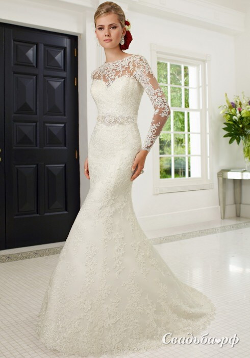 Очаровательная модель из новой коллекции 2014 года подчеркнёт все женственные формы Вашей фигуры. Полупрозрачные рукава и ажурная вставка на груди придают этому свадебному платью скромность и романтичность. Переливающийся пояс привлекает внимание к осиной талии невесты. Облегающее платье постепенно расширяется и переходит в шлейф.