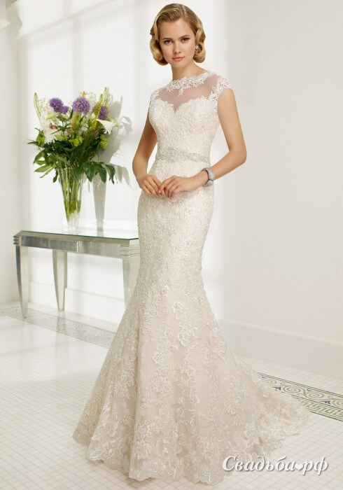Кружевное свадебное платье из новой коллекции 2014 года выполнено в стиле Русалка. Полупрозрачная вставка на груди и ажурные плечики придают модели очарование и романтичность. Талия украшена сверкающей вышивкой. От середины бедра облегающая юбочка начинает расширяться и постепенно переходит в шлейф. Выбор настоящей леди.