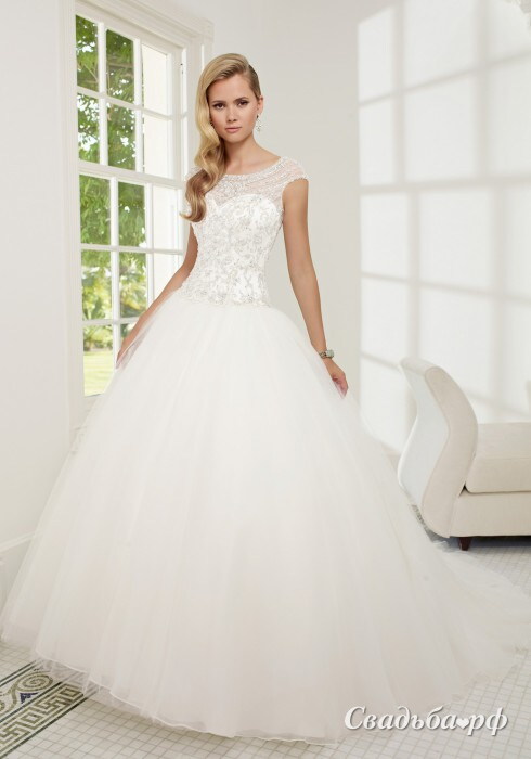 Роскошное свадебное платье из новой коллекции 2014 года отличается стильным дизайном и классическими формами. Элегантный корсет с расшитой вручную полупрозрачной вставкой на груди гармонично сочетается с невероятно пышной юбкой из шёлковой тафты. Модель дополнена кокетливым шлейфом. В таком платье Вы будете блистать!