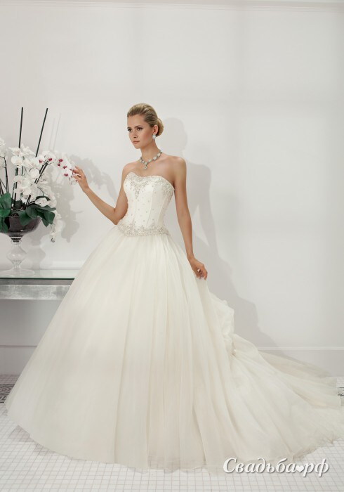 Великолепное свадебное платье с открытой зоной декольте и роскошным шлейфом не оставит равнодушной ни одну модницу. Элегантный корсет расшит сверкающими пайетками. Невероятно пышная юбка придаёт образу неземную лёгкость и сказочную торжественность. В таком свежем наряде вы непременно окажетесь в центре всеобщего внимания.