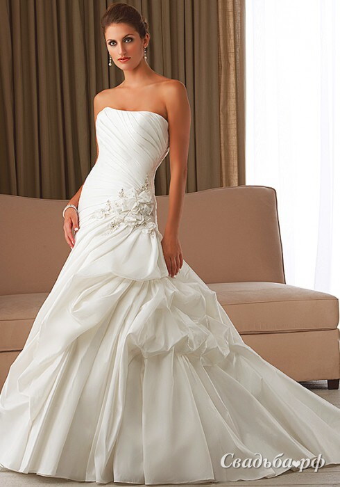 Романтичная модель из свежей коллекции 2014 года выполнено из шёлковой тафты. Это свадебное платье с заниженным корсетом и лёгкой драпировкой подчёркивает изгибы фигуры. На бедре расположились объёмные цветы и сверкающая вышивка ручной работы. Пышная юбочка с оригинальными сборками и складками переходит в кокетливый шлейф.