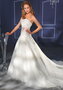 Роскошное свадебное платье А-силуэта может похвастаться сногсшибательным шлейфом и контрастным поясом. Декольтированный корсет украшен объёмной вышивкой, словно стекающей на верх пышной юбки. Эта модель из новой коллекции 2014 года поможет Вам оказаться в центре всеобщего внимания. Наряд подчеркнёт талию и зрительно увеличит бюст.