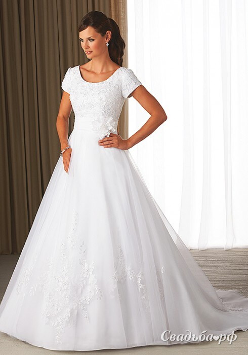 Классическое свадебное платье А-силуэта поможет создать невинный образ невесты. Скромный вырез-лодочка на груди сочетается с короткими рукавчиками. Верх наряда украшен вышивкой. На талии разместился крупный цветок ручной работы. Пышная юбка с кружевными вставками переходит в кокетливый шлейф. Платье подходит и для венчания в церкви.