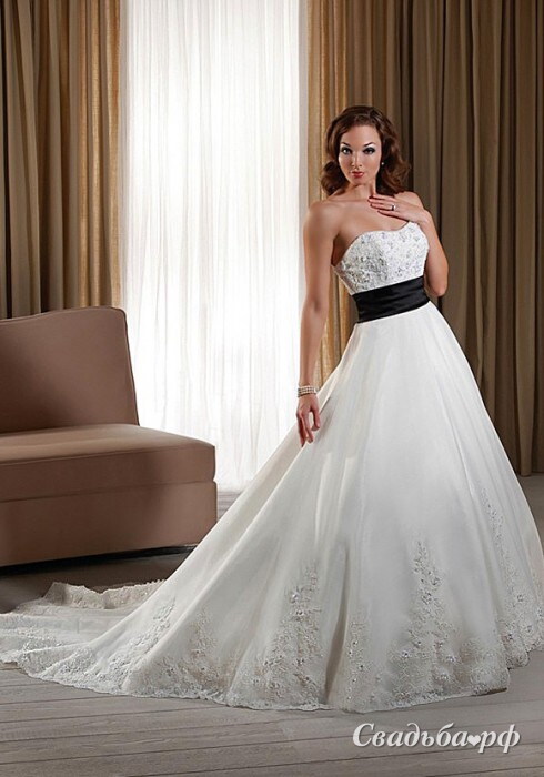 Пышное свадебное платье широким поясом по линии талии придётся по душе любительницам эффектным контрастов. Миниатюрный корсет с открытой зоной декольте вручную расшит сверкающими бусинами и пайетками. Пышная юбка расширяется к полу и переходит в роскошный шлейф. Нижний край наряда также украшен вышивкой. Модель 2014 года.