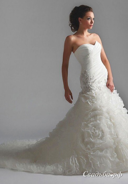 Любительницам оригинальных нарядов мы рады представить это декольтированное свадебное платье. Заниженный корсет с тонкой драпировкой подчёркивает изгибы фигуры. На бедре расположилась изящная вышивка ручной работы. Пышная юбка с необычными сборками в форме огромных бутонов роз переходит в длинный шлейф. Эффектный наряд поражает с первого взгляда.