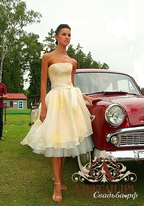 Великолепное платье в стиле блистательной Одри Хепберн вознесет невесту на вершину элегантности и женственности. Подчеркнутая тонким пояском точеная талия, пышная многослойная шелковая юбка и нежный песочно-желтый цвет свадебного наряда сделают образ невесты неимоверно женственным, чувственным, хрупким.