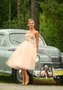 В этом нежно-персиковом платье невеста станет настоящим воплощением элегантности и благородства. Корсет, декорированный множеством кокетливых воланов, стразами Swarovski, бутонами роз и аккуратным поясом, изящно подчеркнет точеную талию и природную красоту обворожительной невесты. А пышная юбка из персиковой вуали в стиле 60-х годов сделает невесту женственной и изящной.