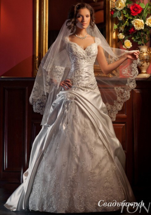 В лучших традициях современной свадебной моды создано это платье. Оно гармонично сочетает холодный белоснежный атлас и тончайшее кружево. Этот прекрасный свадебный туалет перенесет Вас в сказку. Длинная элегантная фата и скромное декольте, юбка с кружевными цветами в нижней четверти. Будет очень красиво на девушке стройной и высокой.
