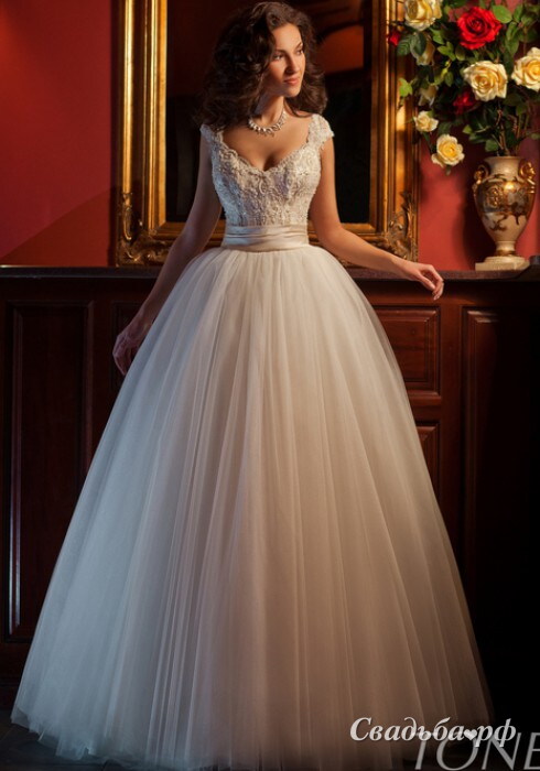 Элегантное платье с вышитым корсетом, выгодно подчёркивающим соблазнительные формы невесты, и пышной многослойной юбкой. Широкая атласная лента исполняет роль пояса и красиво обозначает линию талии. В таком платье очень легко почувствовать себя настоящей королевой свадебной церемонии и всей жизни вообще.