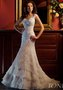 Это облегающее кружевное свадебное платье с изящным силуэтом отлично подойдет для яркой и смелой невесты. Открытая зона декольте, приспущенные плечики-бретели и оригинально драпированный корсет подчёркивают бюст. От середины бедра юбка расширяется и переходит в небольшой шлейф. Подол платья - лёгкие воланы. От 50 размера - 32800 руб.