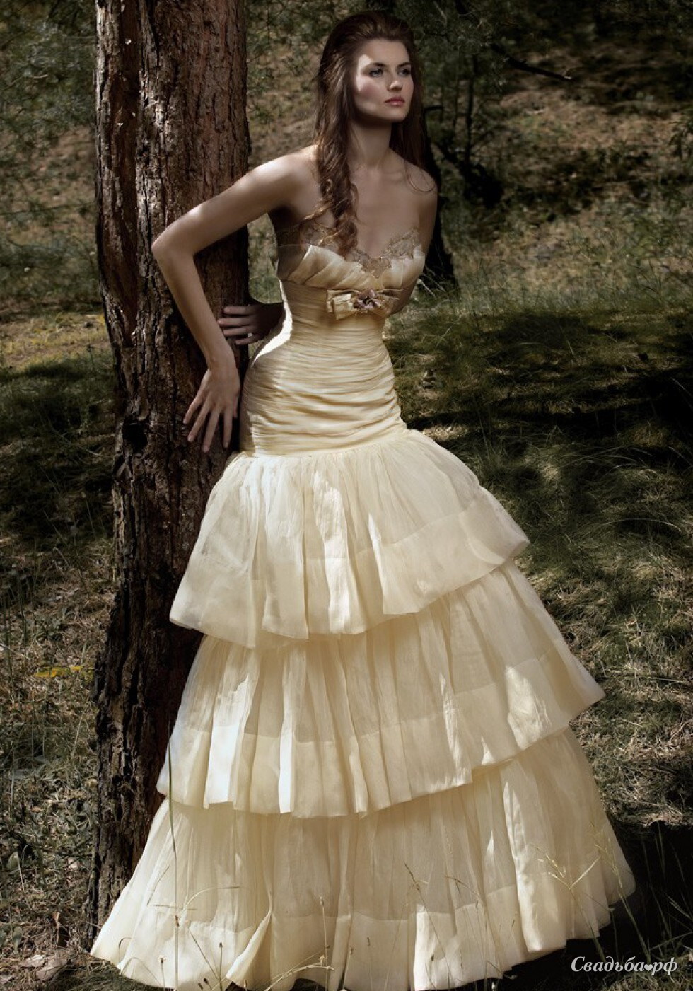 Шикарное свадебное платье темно-кремового цвета никого не оставит равнодушным. Заниженный корсет декорирован объёмными сборками и крупным цветком на груди. Модель выгодно подчёркивает достоинства фигуры. Трёхъярусная юбка придаёт образу воздушность. В наличии 44(38) размера. Получить информацию о наличии данного платья вы можете по телефону 8(495)930-9970.