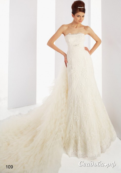 Роскошное свадебное платье с удачным фасоном, идеально подчеркивающим силуэтную линию. Жесткий лиф без бретелей по верхней части декорирован изысканным кружевом, мелкая сборка под грудью расшита бусинами, легкая юбка, струящаяся в пол элегантными складками, сделана из шикарной кружевной ткани. Наряд дополнен съемным шлейфом. В наличии 44(38) размера, уточните наличие модели по телефону 8(495)930-9970.
