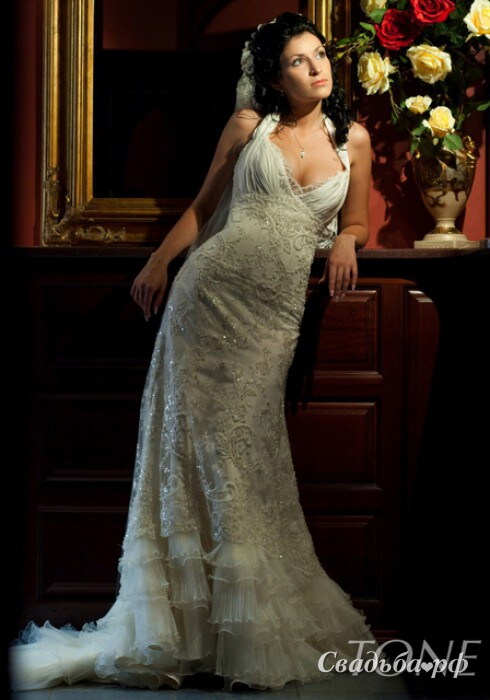 Изысканное свадебное платье прямого силуэта с завышенной талией подойдет высокой стройной невесте. Зону декольте выделяет глубокий вырез, который не оставит вас незамеченной. Платье расшито изысканной вышивкой и камнями. Внизу юбка дополнена несколькими ярусами воздушного шифона и небольшим шлейфом.