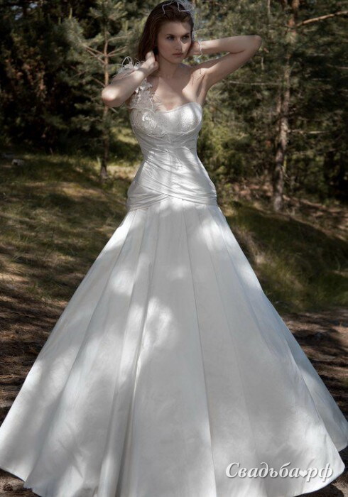 Элегантное корсетное платье А-силуэта выгодно подчеркивает фигуру. Лиф с вырезом лодочкой украшен бисером, кружевная лямочка на одно плечо, несомненно, является изюминкой наряда.