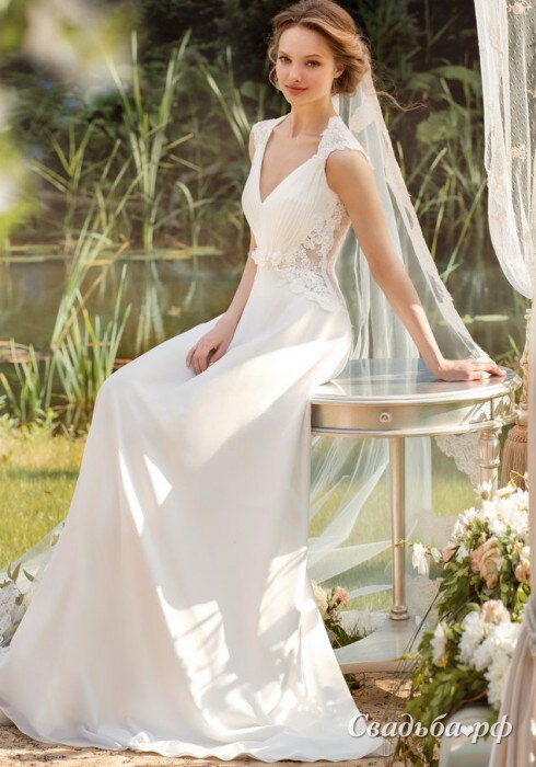 Изысканное силуэтное платье, эффектно демонстрирующее силуэт и грацию девушки. Традиционное сочетание шифона и кружева создали эффект сложности и тонкости. Модель с плотным лифом спереди, густо задрапированным шифоном и полупрозрачной спинкой сменяется спокойной шифоновой юбкой. Плавные линии подреза отделаны кружевными элементами. Нежная и хрупкая брошь ручной работы оттеняет фактуру кружева и как нельзя лучше украшает платье.