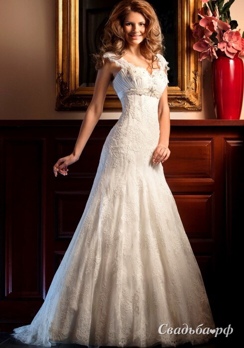 Элегантное кружевное платье, с заниженной линией талии, драпированный лиф дополнен богатой вышивкой бусинками и небольшими стразами.