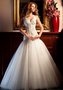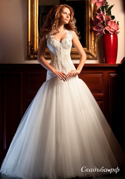 Бесподобное свадебное платье с заниженной талией, лиф наряда украшен кружевом, также расшит пайетками и бисером. Воздушная фатиновая юбка придает образу легкость и изящество.