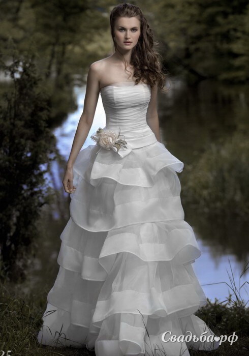Изысканное свадебное платье с оригинальной длинной юбкой из оборок. Плотный корсет, декорированный мелкой драпировкой и дополненный нежной розой из ткани, эффектно подчеркивает все изящество фигуры. Невесомые крупные оборки придают наряду невероятную легкость. В наличии 42(36) и 46(40) размера, уточните информацию по телефону 8(495)930-9970.