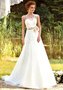 Классическое свадебное платье смотрится очень нежно благодаря прозрачной майке, слегка скрывающей плечи и область декольте. Безупречно повторяющий линии тела корсет со сложной драпировкой отделан нежным кружевом шантильи. Многослойная спокойная по стилистике юбка выгодно оттеняет сложность лифа. Довершает образ контрастный по цвету пояс из тонкого тюля и роскошная роза из органзы.