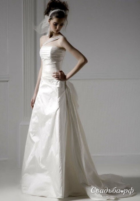 Изысканное свадебное платье классического А-силуэта выполнено в кремовом цвете. Декольтированный верх с асимметричной диагональной бретелью из легкого фатина, расшитого бисером в тон платья, придает наряду шарм, а также выгодно подчеркивает линию груди. Тяжелая многослойная юбка сзади украшена сборками разной величины, которые образуют небольшой шлейф. В наличии 44(38) размер, уточните информацию по телефону 8(495)930-9970.