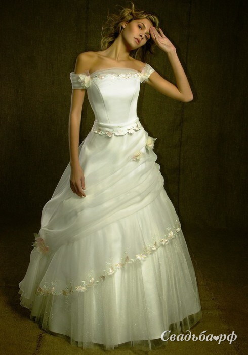 Нежный свадебный наряд, состоящий из корсета и юбки, белого цвета с декором в изысканном стиле с флористическими мотивами. Жесткий корсет из плотного атласа украшен легким фатином, юбка умеренной пышности с легкой асимметричной сборкой и дополнительным ярусом. В наличии 44(38) размера. Уточните наличие модели по телефону 8(495)930-9970.