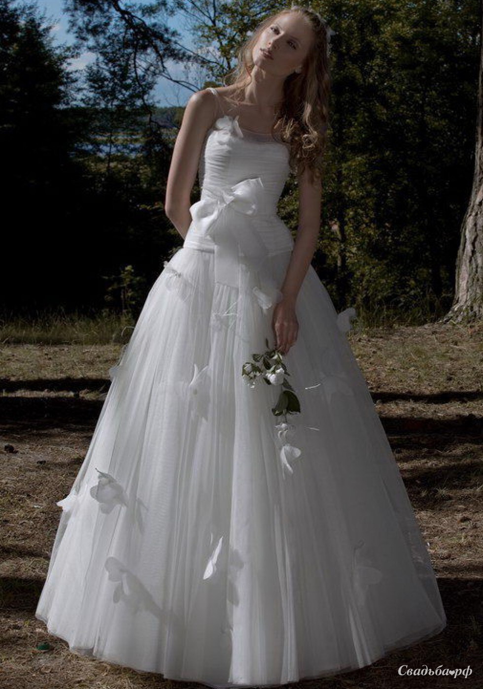 Классический свадебный наряд, состоящий из корсета и юбки, выдержанный в минималистическом стиле. Корсет (без лямок) элегантно очерчивает фигуру невесты, талия акцентирована поясом, декорированным воздушным бантом. Юбка умеренной пышности, украшены лепестками невесомой ткани. В наличии 40(34) размера, белого цвета.