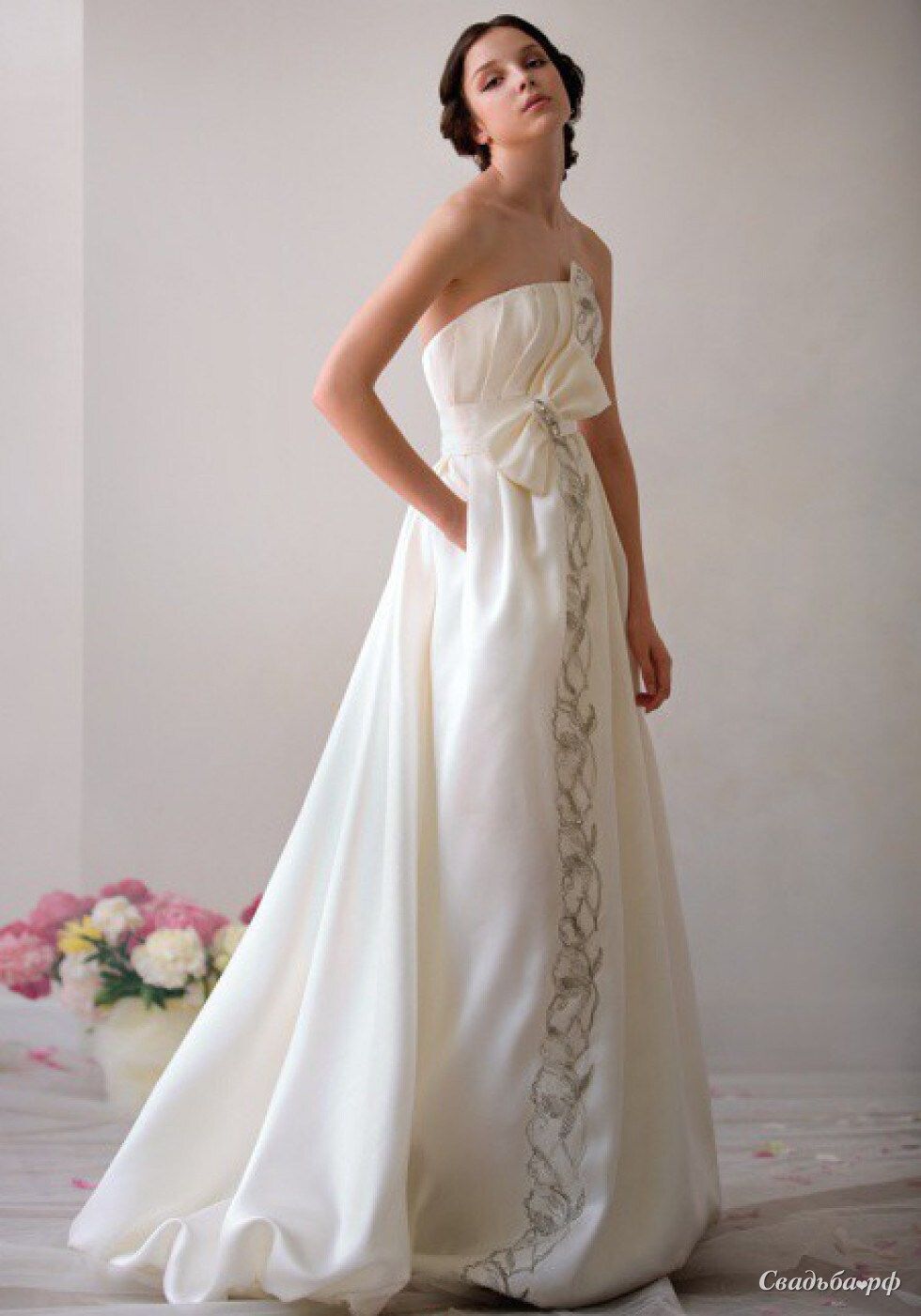 Строгое свадебное платье, выполненное из плотной ткани с карманами. Декольтированный лиф с завышенной линией талии. Стан невесты подчеркивает пояс, украшенный бантом. Изюминка наряда - асимметричная вышивка. В наличии платье 42 (российского) размера с темной вышивкой и 42(российского) размера с вышивкой в тон платья. Уточнить информацию о модели возможно по телефону 8(495)930-9970.