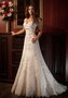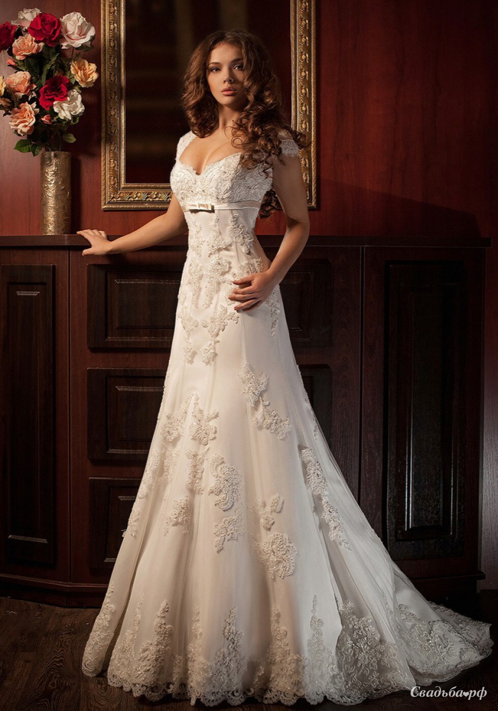 Элегантное свадебное платье, лиф с V-образным вырезом, плечики прикрыты аккуратными широкими лямочками, корсет платья эффектно подчеркивает изгибы фигуры. Наряд декорирован расшитым кружевом. Уточнить информацию возможно по телефону 8(495)930-9970.