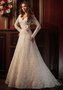 Классическое свадебное платье с длинными рукавчиками, выполненное из кружева, талия подчеркнута элегантным поясом, украшенным нежным цветочком.