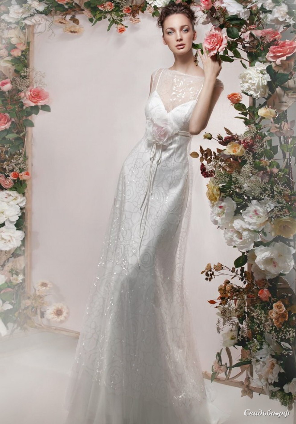 Нежное изысканное свадебное платье кремового цвета с утонченной силуэтной линией. Полукруглый лиф из плотного атласа с тонкими бретелями, поверх декорирован тончайшим фатином с вышивкой, что придает наряду скромность и элегантность. Подчеркивает линию груди сборка в флористическом стиле. Многослойная юбка струится вниз мягкими, воздушными складками. Уточните наличие по телефону 8(495) 930-99-70. В наличии 42(36) размера. Цена платья со скидкой 18200 руб.