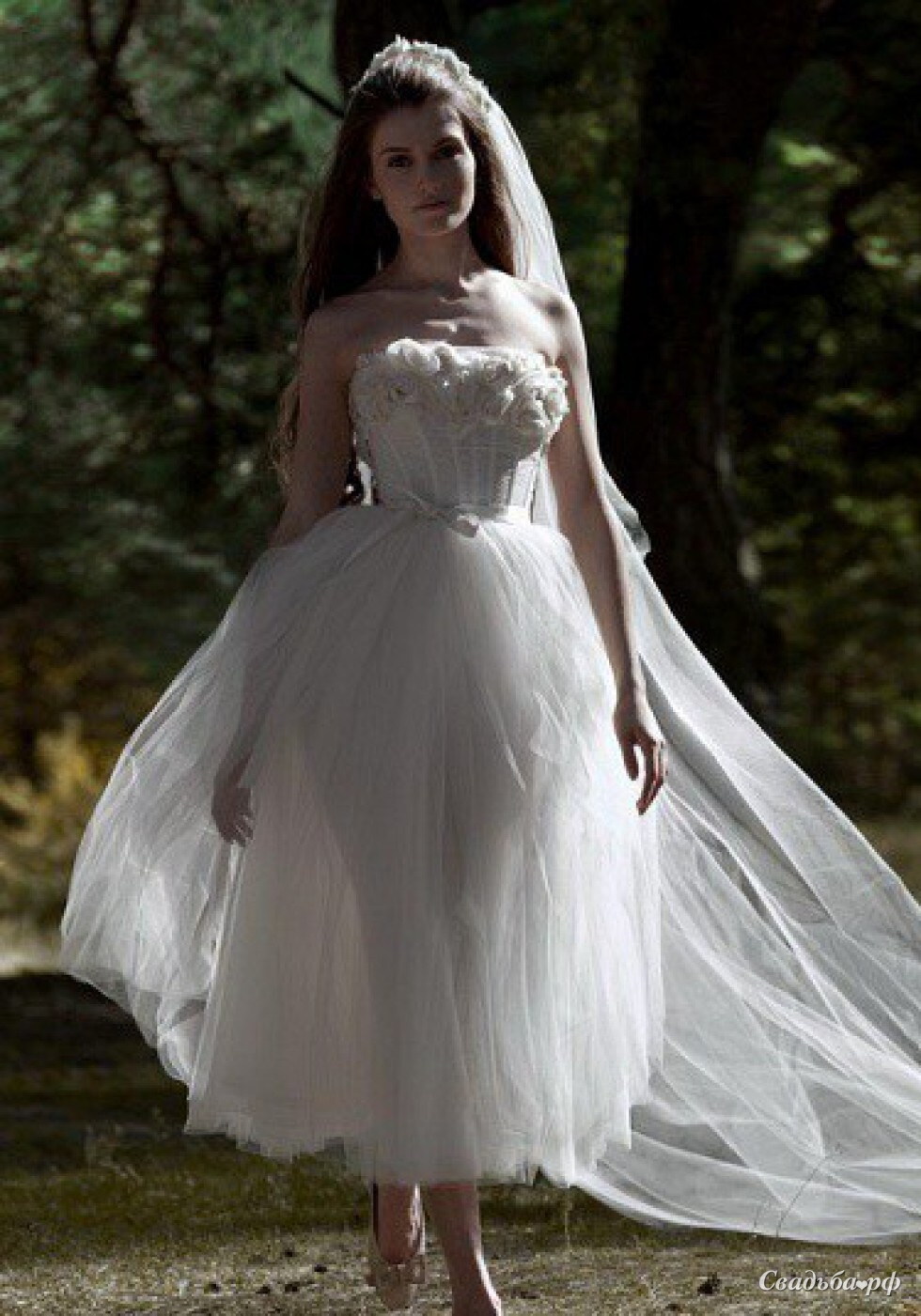 Оригинальное свадебное платье с открытой зоной декольте создано для самых дерзких невест. Изящный корсет с объёмными цветами на груди зрительно увеличивает бюст, а тонкая ленточка выгодно подчёркивает талию. Пышная юбка из полупрозрачного фатина доходит до середины голени и смотрится очень воздушно и эффектно. В наличии 42(36) размера, уточните информацию по телефону 8(495)930-9970.