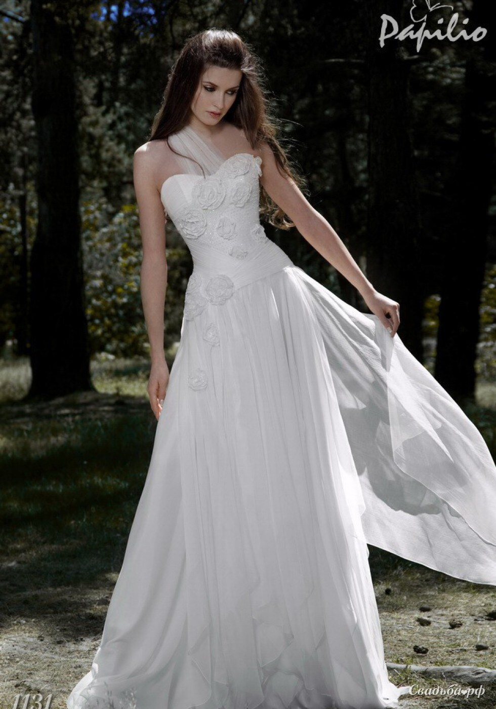 Легкое и нежное свадебное платье, элегантно подчеркивающие талию. Лиф платья, с бретелью на одно плечо, украшен аккуратными розочками, юбка прямого силуэта, придает воздушности образу.
