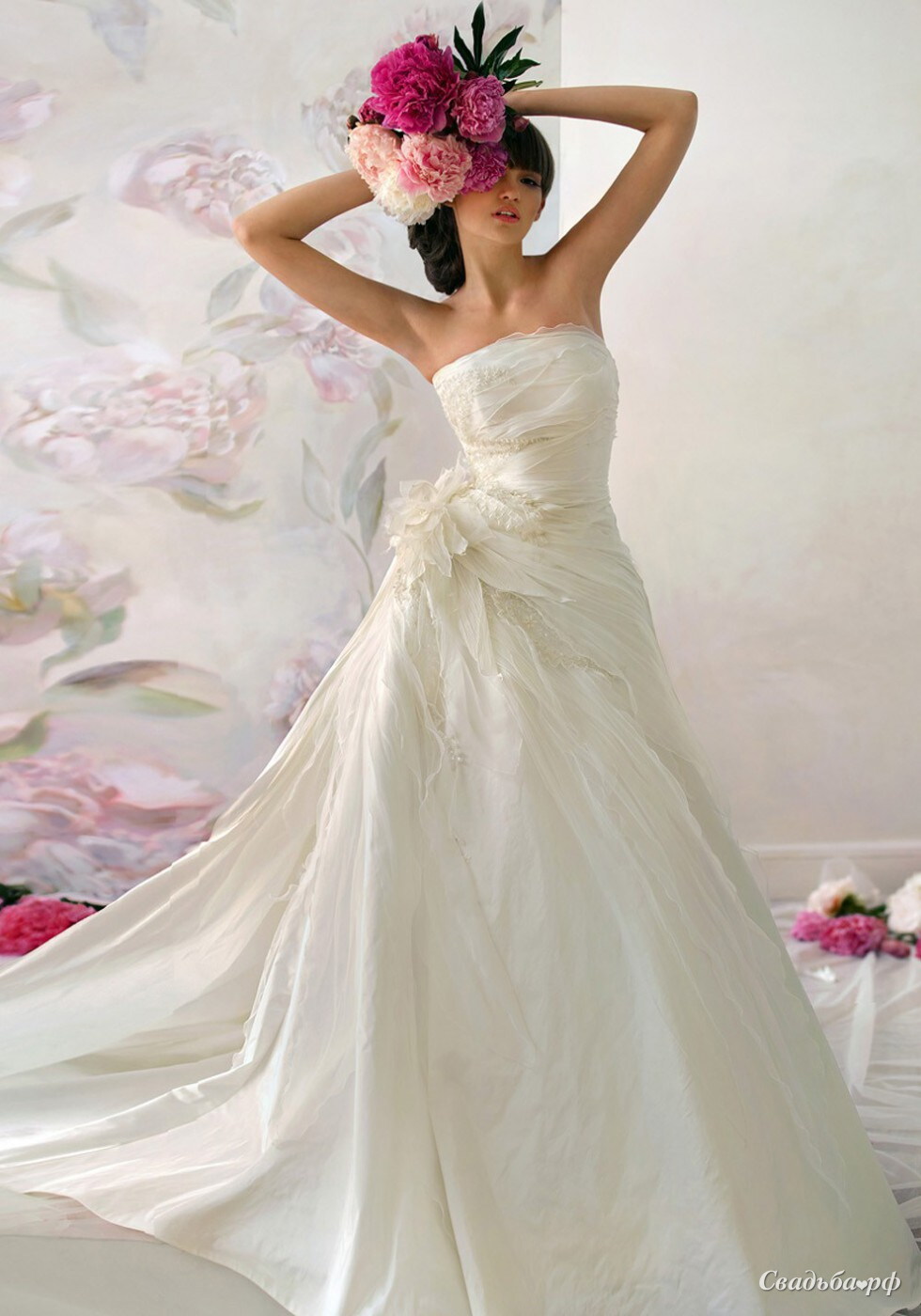 Восхитительное декольтированное свадебное платье, выполненное в флористическом стиле, юбка A-силуэта переходит в небольшой шлейф. Сбоку платье украшено вышивкой и декорировано нежным цветком из органзы. Уточните наличие модели по телефону 8(495)930-9970.